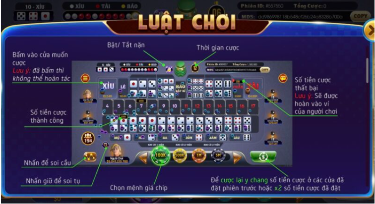 Trong trò chơi Tài Xỉu – Sicbo MegaWin tại 33win, người chơi sẽ thấy một bàn cược với các ô đánh số từ 1 đến 6. Người chơi có thể đặt cược vào một hoặc nhiều ô và sau đó tung ba con xúc xắc để xác định kết quả. Nếu kết quả của ba con xúc xắc khớp với ô mà người chơi đã đặt cược, người chơi sẽ nhận được tiền thưởng theo tỷ lệ cược tương ứng.
