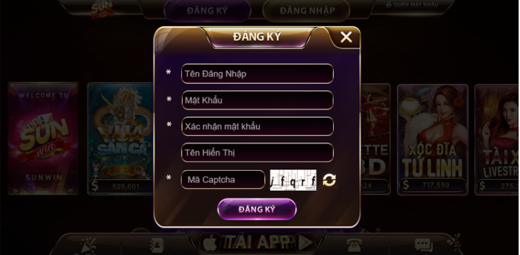 - Bước 2: Điền đầy đủ thông tin theo yêu cầu trong mẫu đăng ký thành viên, bao gồm tên đăng nhập, mật khẩu dễ nhớ, xác nhận mật khẩu, tên hiển thị khi chơi và nhập mã captcha theo hình.